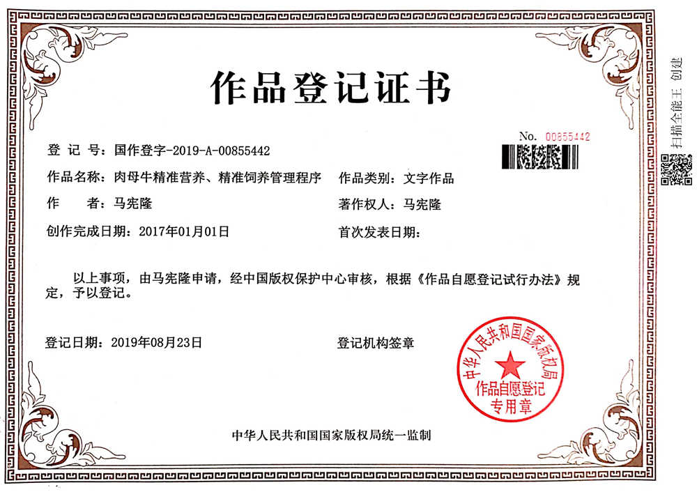 母牛精準模式版權登記證書