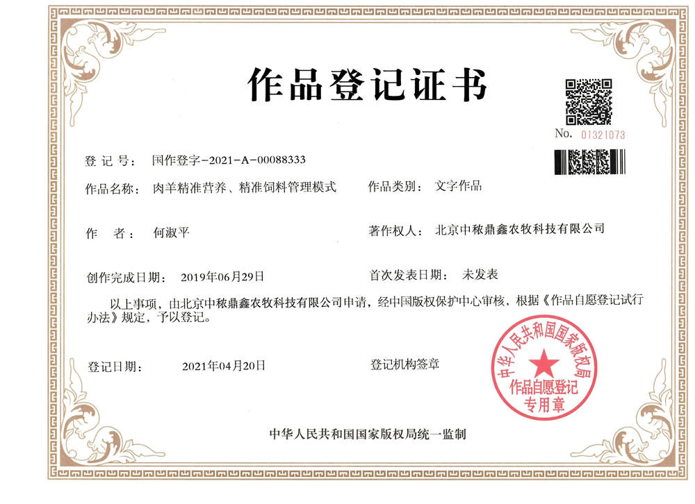 肉羊精準營養版權登記證書